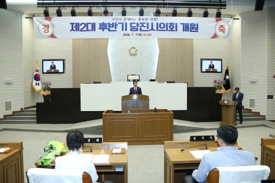 제2대 당진시의회(의장 이종윤)는 7일 오전 10시 본회의장에서 김홍장 당진시장을 비롯해 시의원, 초청내빈 등 100여명이 참석한 가운데 ‘제2대 후반기 당진시의회 개원식’을 갖고 본격적인 의정활동에 들어갔다.