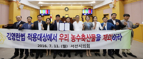 서산시의회(의장 우종재)가 11일, 본회의장에서 김영란법 적용대상에서 우리 농수축산물을 제외해줄 것을 촉구하는 성명을 채택했다.