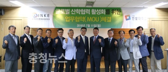 한밭대학교 산학협력선도대학육성사업단(단장 김광주, 이하 LINC사업단)은 11일(월) 서울 INKE월드센터에서 세계한인벤처네트워크(INKE)와 ‘글로벌 산학협력 활성화 및 유기적 협력관계 구축’을 위한 업무협약을 체결했다고 밝혔다.