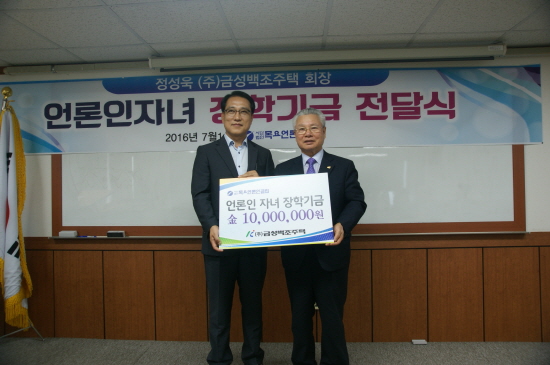 정성욱 (주)금성백조주택 회장이 14일 목요언론인클럽 곽영지 회장에게 언론인자녀 장학금 1천만 원을 전달했다. 목요언론인클럽 이날 7월 정기월례회에 이어 정 회장 장학금 기증 식을 함께 가졌다.
