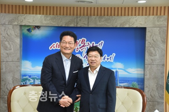 ▲ 송영길 의원이 전당대회 출마 기자간담회에 앞서 권선택 시장을 만나 이야기를 나눴다.