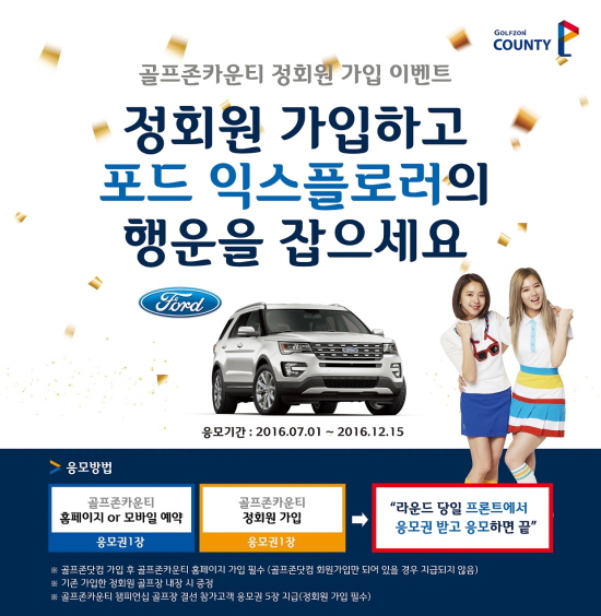 특히 연말을 맞아 12월 25일에는 골프존카운티 정회원 가입 고객 및 내장객을 대상으로 연말 통합 추첨을 진행해 5,600만원 상당의 '2016 포드 익스플로러' 자동차 1대를 경품으로 증정한다.