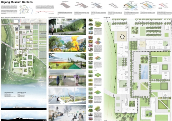 「Sejong Museum Gardens」는 격자형 기본구조를 바탕으로 중앙에 광장을 두고 양쪽으로 박물관 배치를 제안한 작품이다. 도시성과 자연성을 유연성 있게 연결하여 공간적인 질서를 논리적으로 구현하였다는 점에서 높은 평가를 받았다. 또한, 다채로운 조경기법과 유리로 형성된 통로를 통해 중앙공원, 천변과 어우러지는 박물관 정원으로써 아름다운 풍광을 제공한 점이 우수하다.