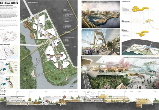 「The Urban Garden」은 많은 작품들이 단지 전체를 격자형 구조로 제시한 것과 대비되는 독특한 유기적 구조의 파빌리온 건물로 구성된 도시정원이라는 정체성을 제안한 작품으로 평가받았다. 단지 가운데 위치한 아트리움 형태의 어반 로비를 중심으로 하는 보행몰과 박물관들 사이에 배치한 작고 다양한 오픈 스페이스들을 연결하여 다채로운 보행환경을 제공한다.