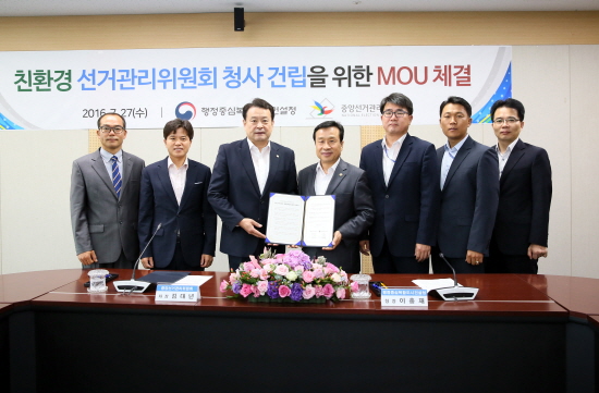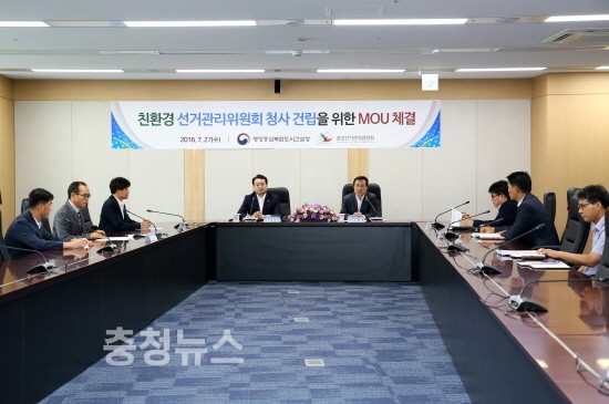 행정중심복합도시건설청(청장 이충재, 이하 행복청)과 중앙선거관리위원회(사무차장 김대년, 이하 중앙선관위)는 27일 정부세종청사 6-3동 행복청 종합상황실에서 친환경 세종시선거관리위원회(이하 세종시선관위) 청사건립을 위한 양해각서를 체결하였다고 밝혔다.