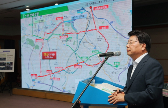 권선택 대전시장이 민선6기 핵심사업으로 꼽는 도시철도 2호선 트램 노선을 확정 발표했다.