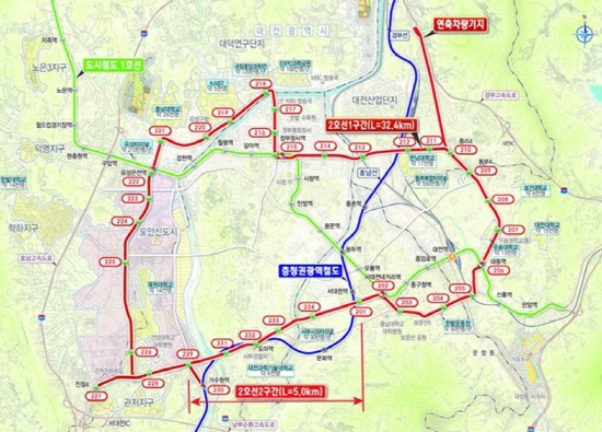 2호선은 1구간과 2구간으로 나누어서 사업을 진행하며 1구간인 서대전역~대동역~중리4~정부청사역~유성온천역~진잠~가수원역, 연장 32.4km, 정류장 30개소, 사업비 5,723억 원을 투자하여 추진한다.