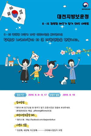 “8·15 광복절 태극기 달기 SNS 이벤트”는 대전지방보훈청 페이스북(http://www.facebook.com/daejeonbohun)에 감사의 메시지, 댓글, 공유, 인증사진 올기기 등으로 참여할 수 있다.