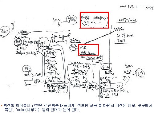 ![]() 영안모자 백성학 회장의 ‘국가정보 유출 의혹’과 관련해 백 회장의 해외담당 고문이 경인방송 신현덕 대표에게 정보원 교육을 시킨 사실이 문건을 통해 확인됐다. 지난달 31일 열린 국회 국정감사에서 이번 사건을 폭로한 경인방송 신현덕 대표의 주장이 사실로 확인된 것이다. 신 대표는 이날 "정보원 교육을 받은 적이 있느냐?"는 열린우리당 지병문 의원의 질의에 대해 "그렇다"고 답변하면서 "관련 내용을 수사기관에서 분명히 밝히겠다"고 말했다. 이에 대해 백성학 회장은 "하루에 작게는 20~30개, 100여개의 이메일이 들어오고 여러 가지 떠돌아다니는 것들 중에 필요한 것을 정리해왔다"며 정보 수집 사실은 일부 시인하면서도, 신 대표에게 정보원 교육을 시킨 사실은 강하게 부인했다. 그러나 백 회장이 해외담당 고문과 함께 신 대표에게 교육을 시켜 온 사실이 CBS가 확보한 비밀 메모로 확인 됐다. 이 문건은 백 회장의 해외담당 고문이 지난 9월 9일 서울 소공동의 한 빌딩 사무실에서 신 대표에게 정보 보고와 관련된 사항을 교육시킨 내용을 고스란히 담고 있다. 북한 핵문제와 관련한 동아시아의 정세 변화 등에 관한 내용을 A4 용지에 직접 기술해가며 일대일 교육을 시킨 내용이다. 신 대표에 대한 정보원 교육은 이 때를 전후해서 몇 차례 더 진행됐으며 미국 정부의 정보기관 현황과 조직체계, 활동 등이 그때 그때 교육내용에 포함되기도 했다. 신 대표에 대한 교육 내용 등에 비춰볼 때 백 회장의 해외담당 고문은 영어에 능통하고, 한반도 주변 정세에 관한 상당한 지식과 뛰어난 정보 수집 능력을 지니고 있는 것으로 판단된다. 단순한 해외담당 고문이 아님을 짐작케 하기에 충분하다. ![]() |
