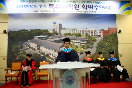 ▲ 12일 열린 한남대 특수대학원 학위수여식에서 이덕훈 총장이 졸업생들을 격려하는 축사를 하고 있다.