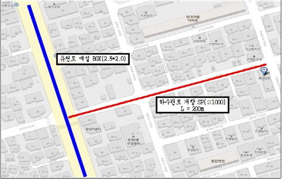 대전시 중구 계백로 1618번길 66(유천동 173-7번지선)은 유천2지구로 국가하천 유등천 우안의 기 개발 도시지역으로 다세대주택 등이 상당수 위치하고 있는 주거지 밀집지역이며 침수발생 시 피해 가중 우려가 있었다.