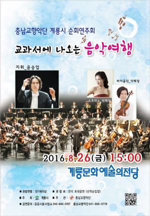 계룡시(시장 최홍묵)는 오는 26일(금) 오후 3시 ‘교과서에 나오는 음악여행’을 주제로 충남교향악단 순회 연주회가 계룡문화예술의전당 대공연장에서 열린다고 밝혔다.