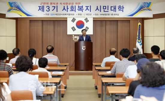 태안군에 따르면, 태안군사회복지협의회(회장 윤희신)는 17일 군 농협중앙회 회의실에서 한상기 군수를 비롯한 사회복지 관련 기관·단체장, 수강생 등 70여 명이 참석한 가운데 제3기 사회복지 시민대학 개강식을 열었다.