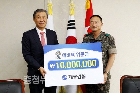 계룡건설(명예회장 이인구)은 19일 오전 11시 육군본부에서 김해석 육군 인사사령관(중장)에게 ‘예비역 추석 명절 위문금’ 1000만원을 전달했다고 밝혔다.