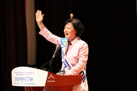 먼저 연설에 나선 추미애 후보는 “대전은 노무현 정권 당시 지방분권 국토균형발전의 상징”이라며 “당 대표가 된다면 대전을 행정중심도시로 만들겠다”고 말했다.