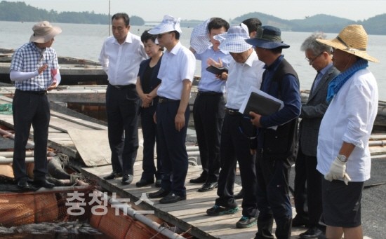 ▲ 신권범 서산시 행양수산과장(좌) 폭염피해 현장을방문한 성일종 국회의원 ,해양수산부, 맹부영 충남해양수사국장, 윤영득 서산시의회 부의장,서산수협 등 관계자들께 피해현황을 보고 하고 있다.