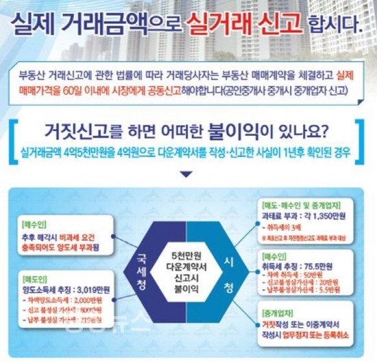 국세청에서 적발한 실거래신고 위반 건에 대해서는 매도인과 매수인에게 과태료를 부과하고, 거짓계약서를 작성한 중개업자는 등록취소와 업무정지 등 행정처분을 내릴 방침이다.
