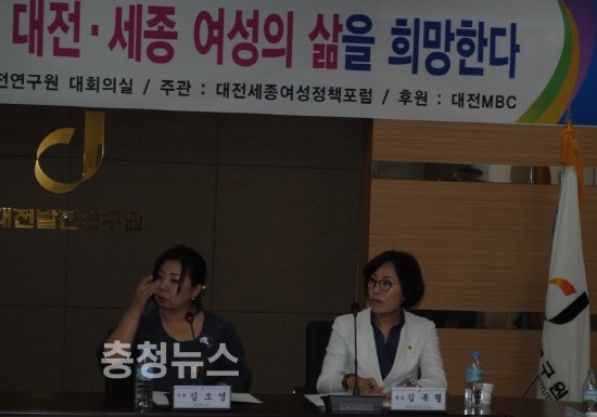 이날 토론자는 김소영 충남대학교 교수의 사회로 박정현 대전광역시의원, 임연희 디트뉴스24 부장, 김경희 대전여성정치네트워크 공동대표, 박종서 한국보건사회연구원, 오가현 노무법인 한영대표, 주혜진 대전발전연구원 대전여성가족정책센터장 등이 참석했다.