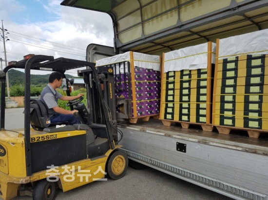 ▲ 세종시가 30일 조치원농협 수출선과장에서 포도와 배를 홍콩으로 첫 수출했다. 사진은 수출을 위해 포도와 배 상자를 트럭에 싣는 모습.