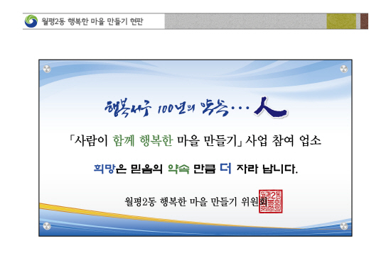 대전 서구(구청장 장종태) 월평2동에서는 30일 월평동 위아래 복집에서 “행복한 마을 만들기” 주민 릴레이 운동 일환으로 ‘행복한 마을 만들기’ 제1호점 현판식을 가졌다 밝혔다.
