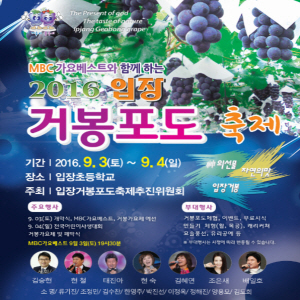 ‘2016 입장거봉포도축제 및 제6회 전국어린이사생대회’가 ‘神의 선물, 자연의 맛, 입장 거봉’이라는 주제로 9월 3일부터 이틀간 천안시 입장면 입장초등학교 운동장에서 개최된다고 밝혔다.
