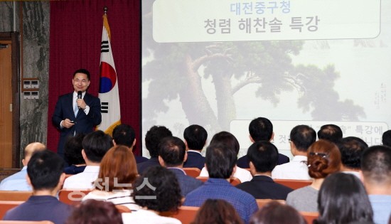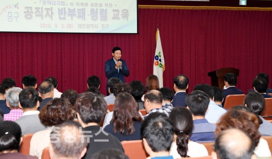 이번 청렴교육은 전문교육기관인 에듀맥스 김병진 대표를 초빙해 법조문과 관련된 사례중심으로 교육을 전개했으며, 이 자리에는 박용갑 청장을 비롯한 간부공무원 및 직원, 중구의회 위원 등 200여 명이 참석했다.