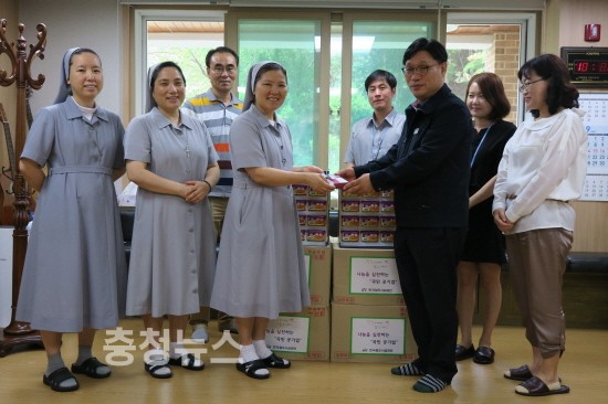 ▲ 공단 신성열 경영노무처장 (오른쪽) 대전 나자렛집 안신자 피에리나 원장수녀님 (왼쪽) 생필품을 전달하는 사진입니다
