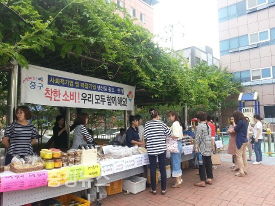 대전 중구(구청장 박용갑)는 7을 구청 등나무 쉼터에서 민족 고유의 명절인 추석을 맞아 마을기업 제품 홍보와 판로확보 지원을 통한 자립기반을 제공하기 위해 ‘마을기업 제품 직거래장터’를 개최했다고 밝혔다.
