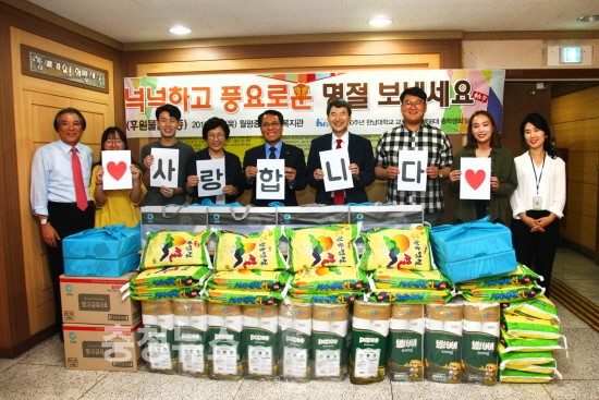 한남대 이덕훈 총장과 이상호 총학생회장 등은 8일 추석을 앞두고 대전 월평종합사회복지관을 방문해 쌀과 과일 등 위문품을 전달했다고 밝혔다.