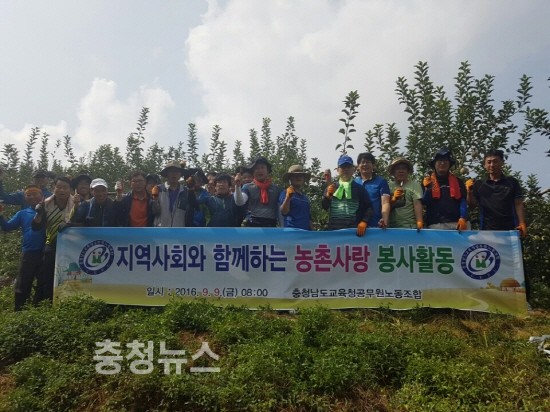 도교육청은 9일 충남도교육청공무원노동조합(위원장 이관우)과 함께 농촌인구의 감소와 고령화로 일손부족 현상이 날로 심해지고 인건비도 매년 상승을 거듭해 일손 확보에 큰 어려움을 겪고 있는 예산지역의 한 과수 농가를 찾아 봉사활동을 펼쳤다. 이 날 봉사단 30여명은 구슬땀을 흘리며 사과나무 순 정리 및 잡초 제거 등 기초 영농 봉사활동을 했다.