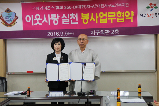 대전 서구노인복지관(관장 장곡스님)이 9일 국제라이온스협회 356-B지구(총재, 송경자)와 ‘이웃사랑 실천’ 관련 봉사협약을 체결했다.