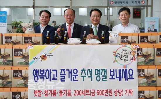 12일 동구청 1층 로비에서 참기름, 햅쌀, 오곡 등 200세트 기탁식 대전 동구(구청장 한현택)는 12일 구청 1층 로비에서 동구 주민사랑네트워크(상임대표 김제홍)가 추석을 맞아 관내 홀로 사시는 어르신들과 사회복지시설에 전달해달라며 600만 원 상당의 참기름, 들기름, 햅쌀, 오곡 등 200세트를 동구 대표 복지브랜드인 ‘천사의 손길 행복+’ 운동에 기탁했다고 밝혔다. ▲ 동구 주민사랑네트워크, 600만 원 상당 추석선물 기탁 저작권자 © 충청뉴스 무단전재 및 재배포 금지 김윤아 기자 다른기사 보기 기사가 마음에 드셨나요? 충청뉴스 좋은 기사 후원하기 1,000원 3,000원 5,000원 10,000원 30,000원 50,000원 직접입력 비회원 약관동의하기 ※ 소중한 후원금은 더 좋은 기사를 만드는데 쓰겠습니다.