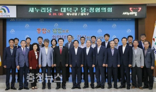 대덕구(구청장 박수범)와 새누리당 대덕구당원협의회(국회의원 정용기)은 지난 20일 대덕구청 중회의실에서 충청권 광역철도 오정역 및 조차장역 설치, 연축지구 도시개발 사업 등 22개 지역현안사업 추진을 위한 대책마련과 예산확보를 위한 당정협의회를 개최했다고 밝혔다.