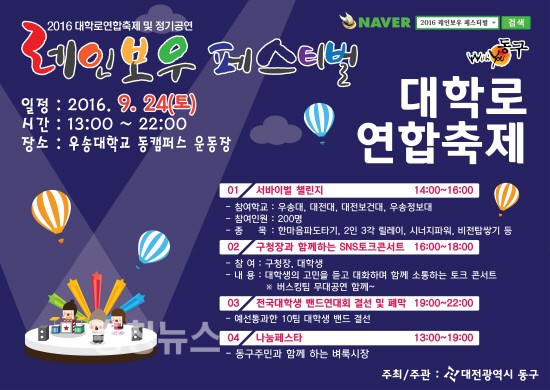 대전 동구(구청장 한현택)는 지난 10일 열린 대학로 정기공연에 이어 2016 레인보우페스티벌의 두 번째 행사인 대학로 연합축제를 오는 24일 우송대학교 동캠퍼스 운동장에서 개최한다고 21일 밝혔다.