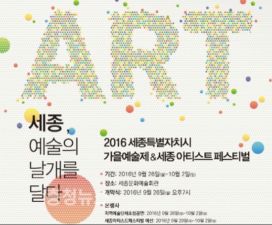 오는 26일부터 10월2일까지 세종문화예술회관에서 ‘예술이 빛나는 행복마을 프로젝트’ 2016 세종가을예술제 및 세종아티스트페스티벌이 개최된다.