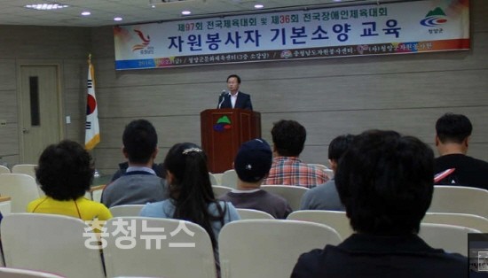 청양군은 23일 문화체육센터 소강당에서 제97회 전국체육대회에 참여하는 자원봉사자 50여명을 대상으로 소양교육을 실시했다.