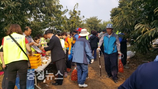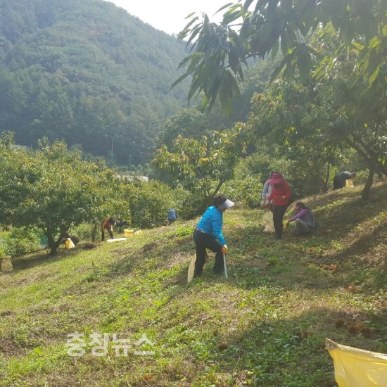 또한 정산면(면장 김성근)은 지난 23일 남천리에서 NH개발 대전충남지사(지사장 박한식) 임직원 30여명이 참여한 가운데 밤 출하시기를 놓치지 않도록 수확 작업을 도왔다.