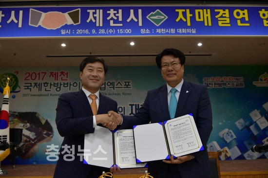 이날 협약식은 자매결연 협정서 서명 및 교환, 시민대표단 담화 후 제천시 한방엑스포공원에서 열리는 2016 제천한방바이오박람회장을 견학하는 순서로 진행됐다.