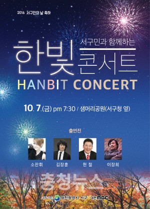 대전 서구(구청장 장종태)는 7일 저녁 7시 30분, 샘머리공원에서 제27회 구민의 날을 축하는 “한빛콘서트”를 개최한다고 밝혔다.