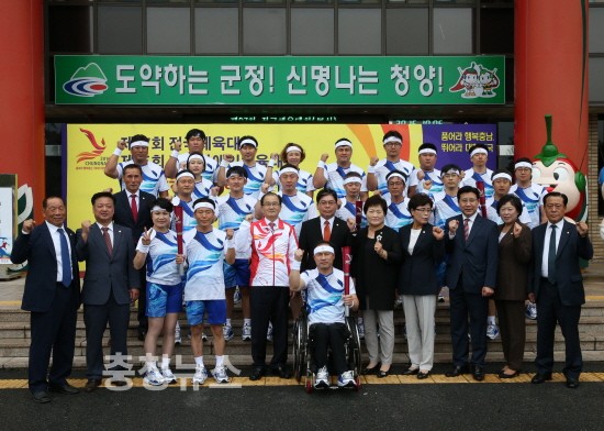 제97회 전국체육대회 및 제36회 전국장애인 체육대회 성공개최를 기원하는 성화봉송 출발 행사가 5일 청양군에서 성대하게 열렸다고 밝혔다.