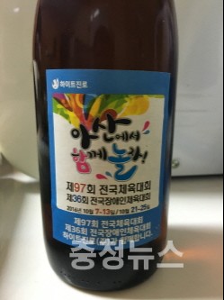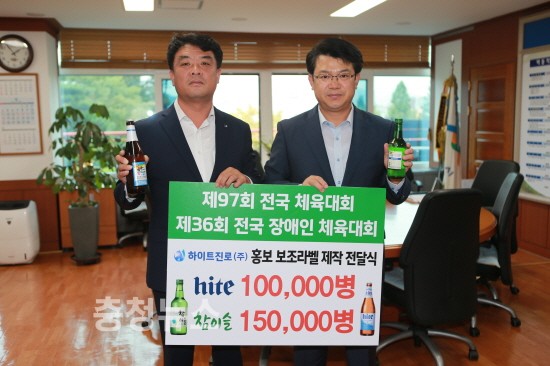 충남 아산시(시장 복기왕)가 지난 9월 30일 ㈜하이트진로 특판천안지점(지점장 이도은)이 시장실에서 제97회 전국체전 및 제36회 전국장애인체전(이하 양대체전)을 홍보하는 보조라벨 전달식을 가졌다고 밝혔다.
