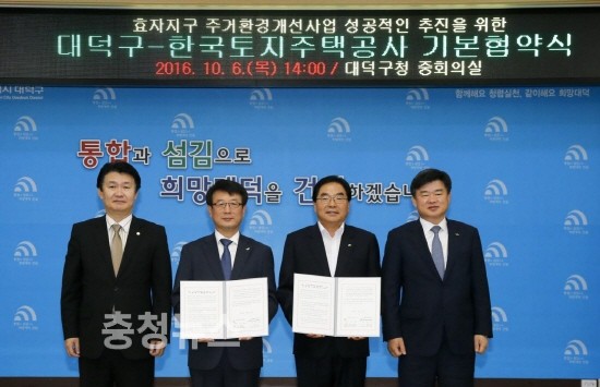 박수범 대덕구청장은 “이번 업무협약으로 그간 사업추진이 부진했던 효자지구 주거환경개선사업이 원활히 수행되길 기대한다”며 “비록 기본협약 단계이지만 이를 사업 속행의 밑바탕으로 삼아 사업을 성공적으로 완료할 수 있도록 최선의 노력을 다하겠다”고 말했다.