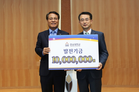 한남대 총장 이덕훈은 6일 이걸우 특임부총장과 손호영 정보시스템관리팀장이 각각 학교발전기금 1,000만원과 500만원을 기탁했다고 밝혔다.