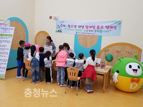 충남대학교병원(원장 김봉옥) 대전지역암센터는 지난 6일(목) 10시부터 15시까지 대전 어린이 회관(대전월드컵경기장 내)에서 국민 암 예방 10대 수칙 지키기 지문트리 이벤트, 암 예방 수칙 관련 OX 퀴즈, 암 모형 전시, 대전지역암센터 캐릭터 ‘항암이’와의 즉석 사진촬영 등 키즈리본 캠페인을 진행하였다고 밝혔다.