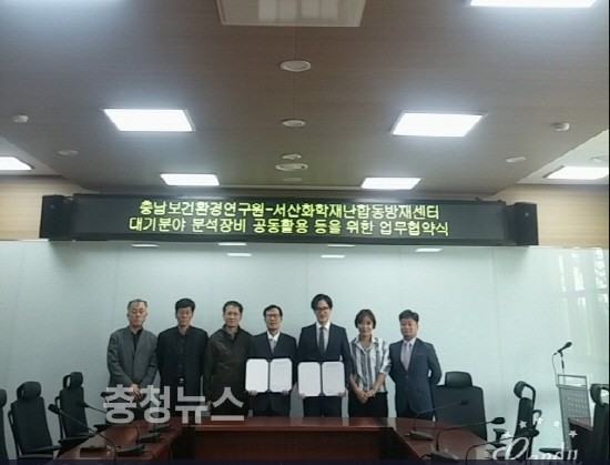 충남도 보건환경연구원(원장 이재중)은 11일 연구원 회의실에서 서산화학재난합동방재센터(센터장 배종수)와 ‘대기분야 분석 장비 공동 활용 등을 위한 업무협약’을 체결했다고 밝혔다.