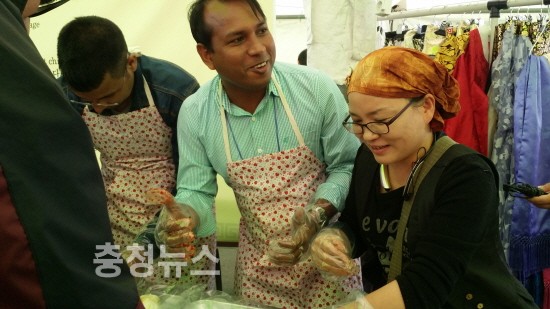 ▲ 배재대 한국어교육원 외국인 학생들이 강경젓갈축제를 방문해 김치담그기 행사를 펼치고 있다.