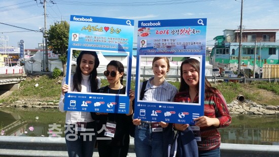 ▲ SNS 서포터즈 부스 앞에서 외국인 관람객들이 포즈를 취하고 있다.