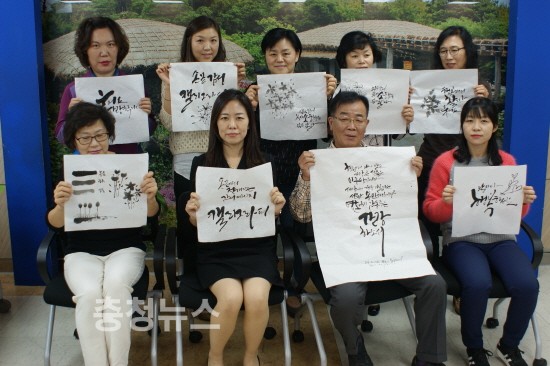 ▲ 수강생들이 작성한 붓글씨를 선보이고 있다. / 충청뉴스 최형순 기자