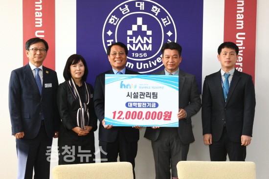 ▲ 한남대 시설관리팀 이주섭 팀장(오른쪽 두 번 째)등 직원들이 이덕훈 총장(왼쪽 세 번째)에게 대학발전기금 1,200만원을 기탁하고 있다