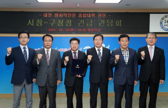 권선택 대전시장과 5개 구청장이 20일 시청 중회의실에서 원자력안전 긴급 간담회를 갖고 대전으로 유입된 고준위 사용후핵연료 등 시민안전을 위협하는 핵폐기물의 즉각 이전을 촉구했다.